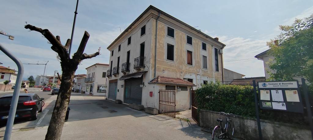 Dueville, Loc. Povolaro: centro paese intera palazzina terracielo su tre oiani fuori terra, composta da piano terra negozio vetrinato con ingresso indipendente, piano terra locale commerciale (ex pizzeria) sviluppato su terra e primo piano con ingresso indipendente e scoperto privato; al secondo piano due appartamenti bicamere e servizio.